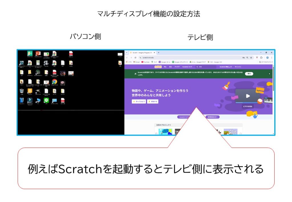 パソコンがない場合は、保護者様のスマホにGoogleMeetを立ち上げ、それを見ながら学校から貸与されたパソコンでScratchをしていただきたいと考えています。