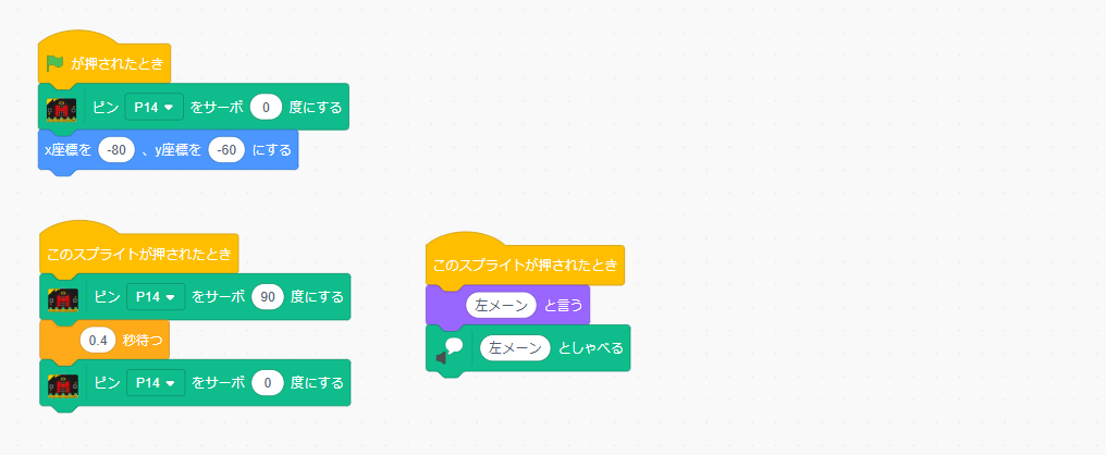 これは、左の剣をタップした指示を受けて、言葉を表示すること、音声を出すこと、同時にmicro:bitへ左の剣の動きを指示するプログラムです。