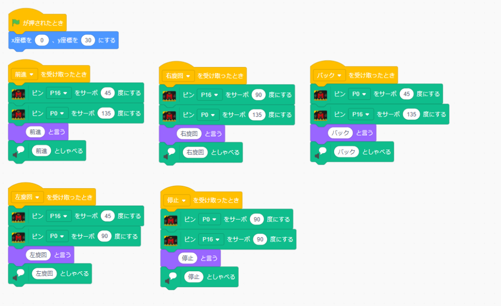 これは、上記でクリックまたはタップした指示を受けて、言葉を表示すること、音声を出すこと、同時にmicro:bitへ両足の動きを指示するプログラムです。