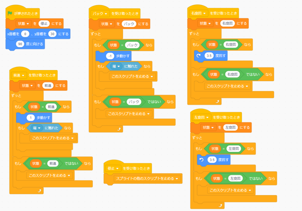 これは、実際のムサシを動かすだけでは、Scratchの勉強になりませんので、コントローラ画面にムサシを表示して、実際のムサシの動きとシンクロさせるプログラムです。