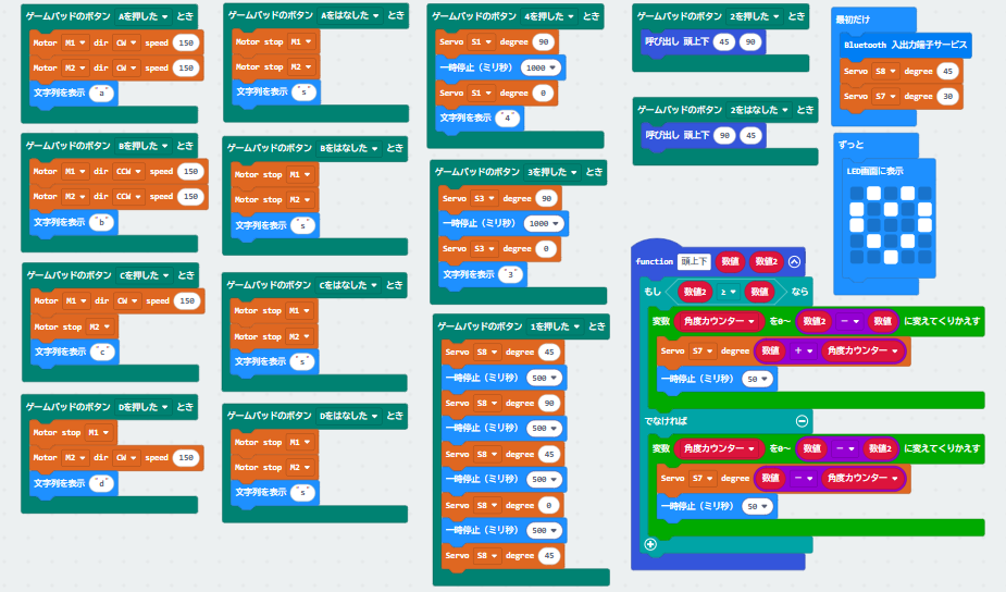 iPhoneの場合は、スマホ版MakeCode(micro:bit)を使います。このアプリはスマホ側でのプログラム修正はできません。このGamepadでA~D、1~4を押した時、離した時の16パターンの条件をMakeCodeでプログラムを作成しmicro:bitにダウンロードします。