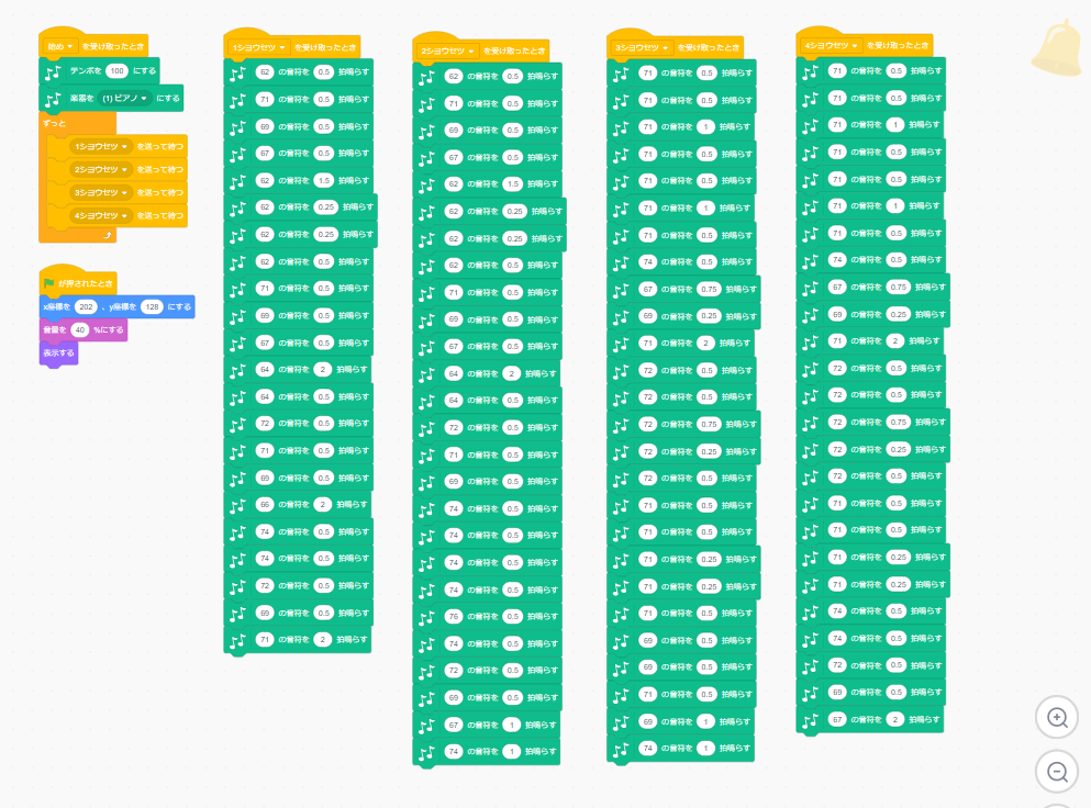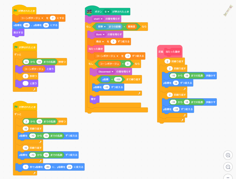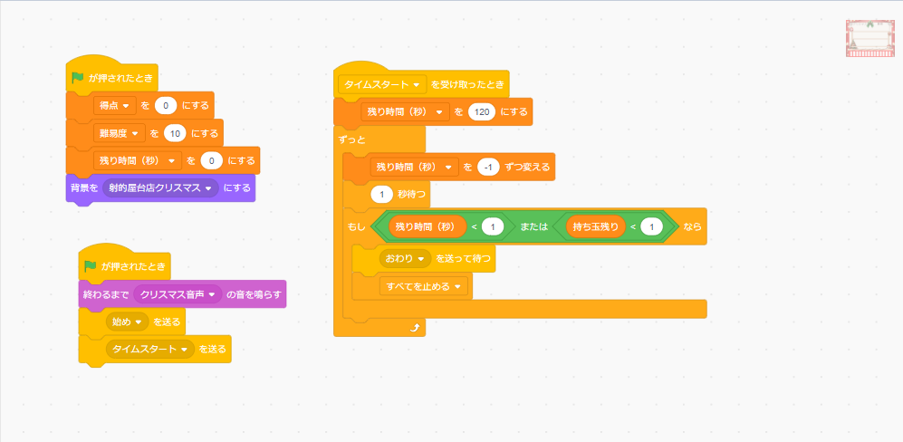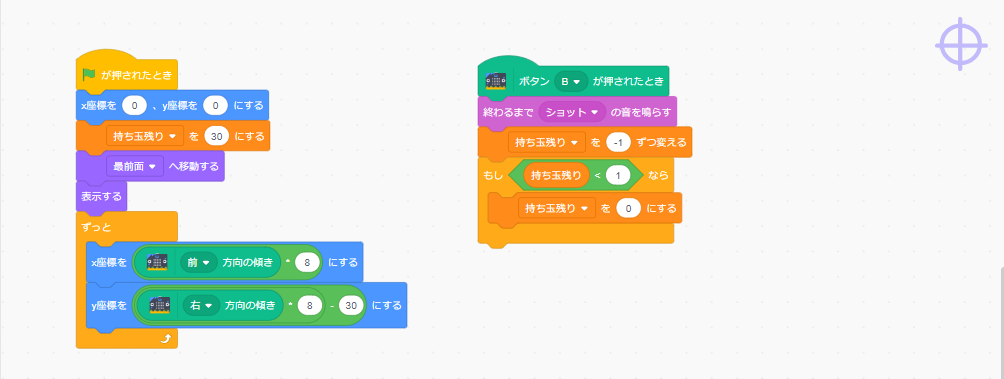 ②夜店の射的ゲーム 2024.11.012026.01.02 電子工作した射的銃 主なScratchのプログラム 的のプログラム(このプログラムを的の数だけコピーして作ります) 銃の照準のプログラム クリスマスソングのプログラム 背景のプログラム